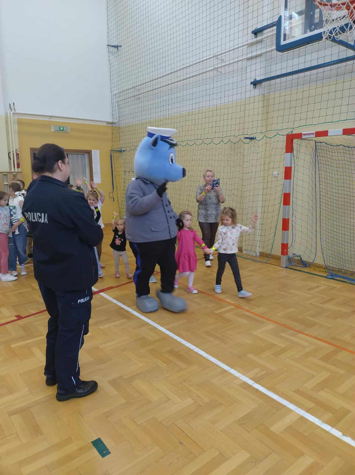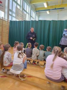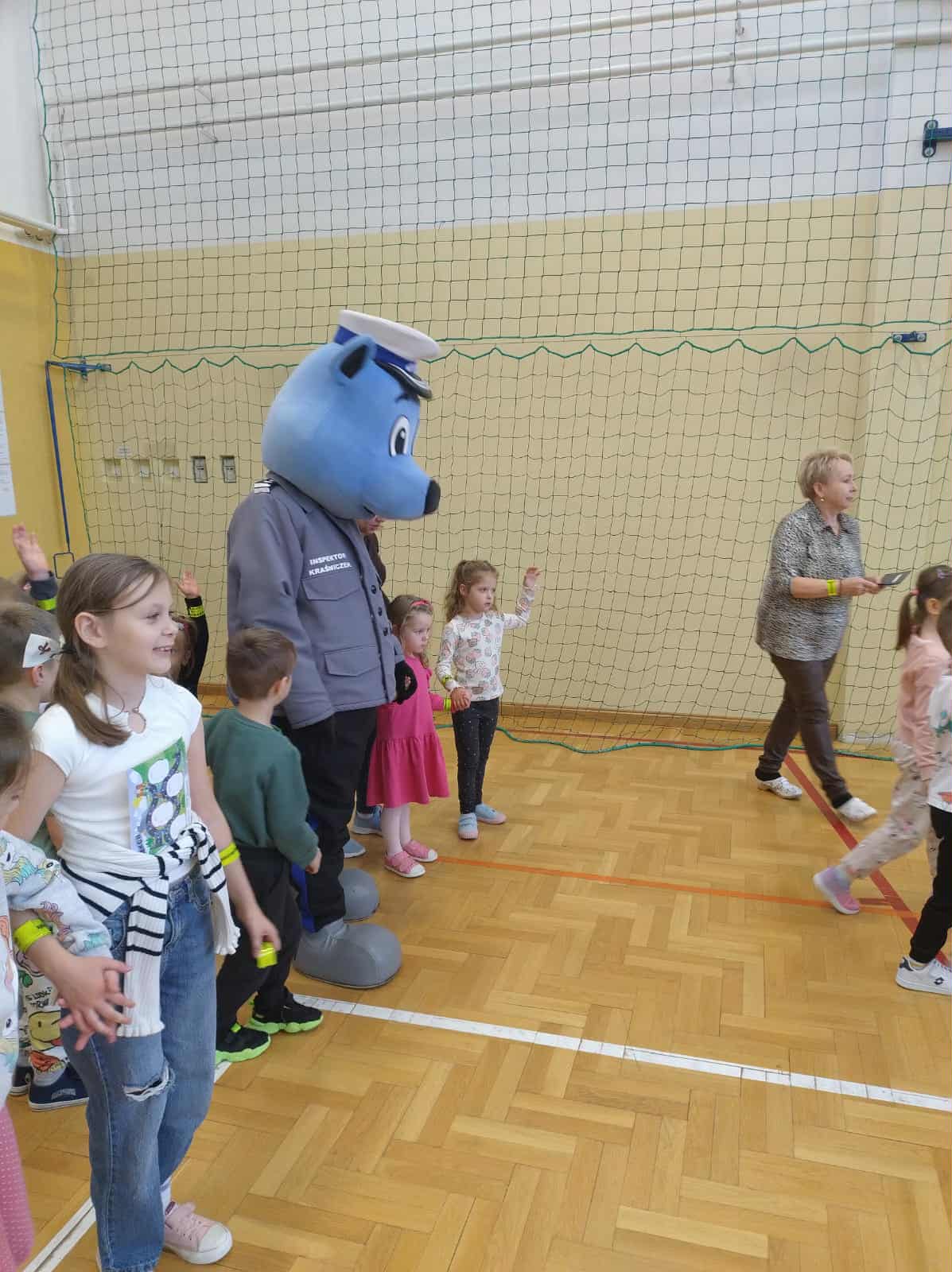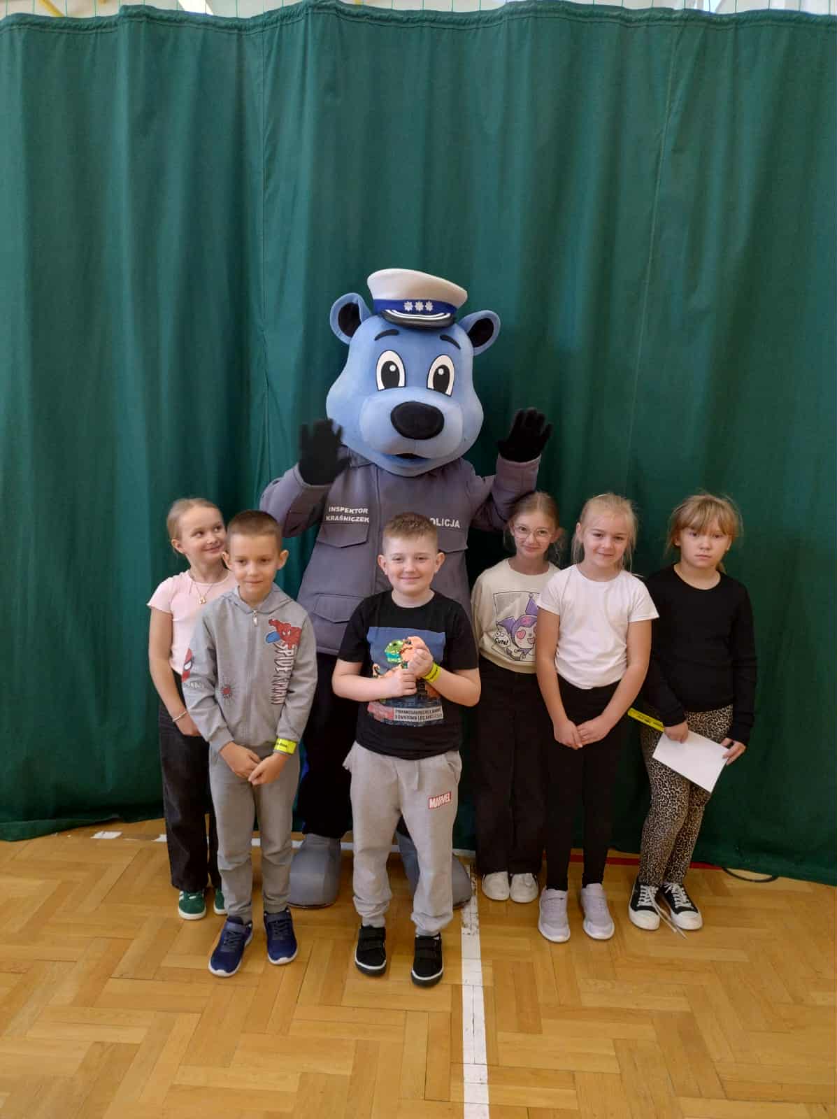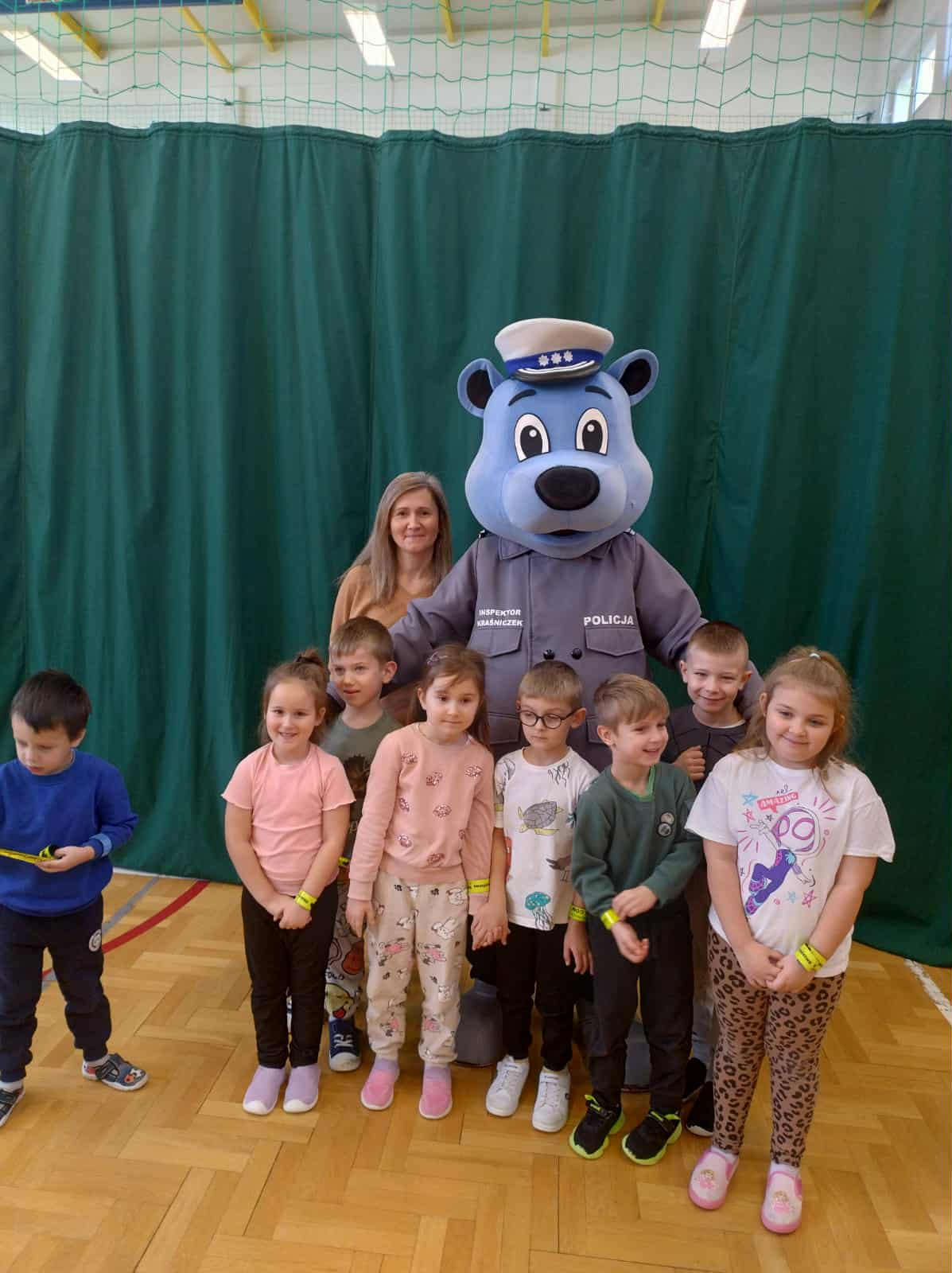 Uczniowie klas I – III oraz dzieci z oddziałów przedszkolnych naszej szkoły uczestniczyli w spotkaniu z policjantami z Komendy Powiatowej Policji w Kraśniku. Zaplanowane spotkanie miało charakter prewencyjny i dotyczyło bezpieczeństwa dzieci na drodze idących do i wracających ze szkoły, prawidłowego przechodzenia przez jezdnię, poruszania się rowerem. Miś Inspektor Kraśniczek zaprezentował dzieciom jak należy przechodzić przez jezdnię na pasach. Podczas spotkania podkreślono również ogromne znaczenie noszenia elementów odblaskowych. Uczniowie aktywnie uczestniczyli w spotkaniu, słuchając i zadając pytania związane z tematem bezpieczeństwa.