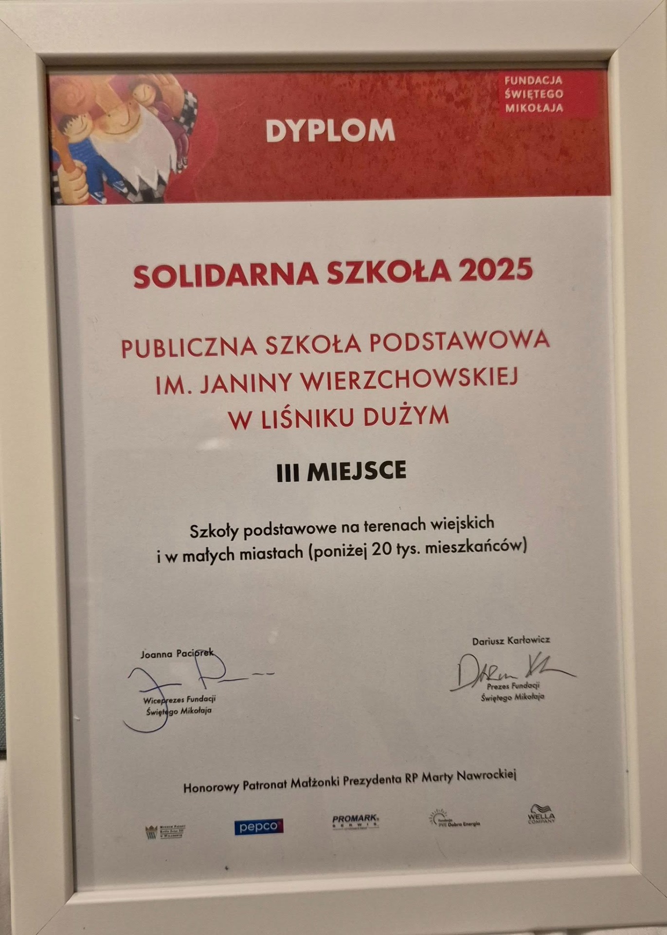2. grudnia 2025 roku, podczas uroczystej gali w Pałacu w Wilanowie, nasza szkoła odebrała nagrodę Fundacja Świętego Mikołaja za zajęcie 3. miejsca wśród 43 szkół podstawowych z terenów wiejskich i małych miast (poniżej 20 tys. mieszkańców).